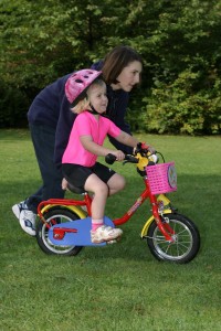 The traditional method of teaching a child to cycle – if we ignore the Spartan-like approach of rolling the learner child down a hillside and hoping for the best – is to run alongside, controlling the steering. This may work. Eventually. The pic on the left shows this method (it’s not good for the parent’s back, and, oy, that helmet’s not fitted correctly!).