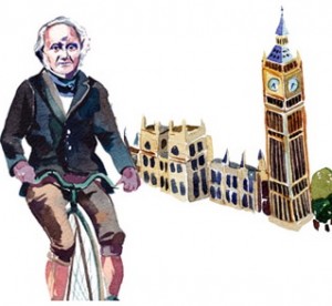 The image of George Peabody on an Ordinary high-wheel bicycle is fanciful: he died in 1869, the year before the advent of the so-called ‘Penny Farthing’.