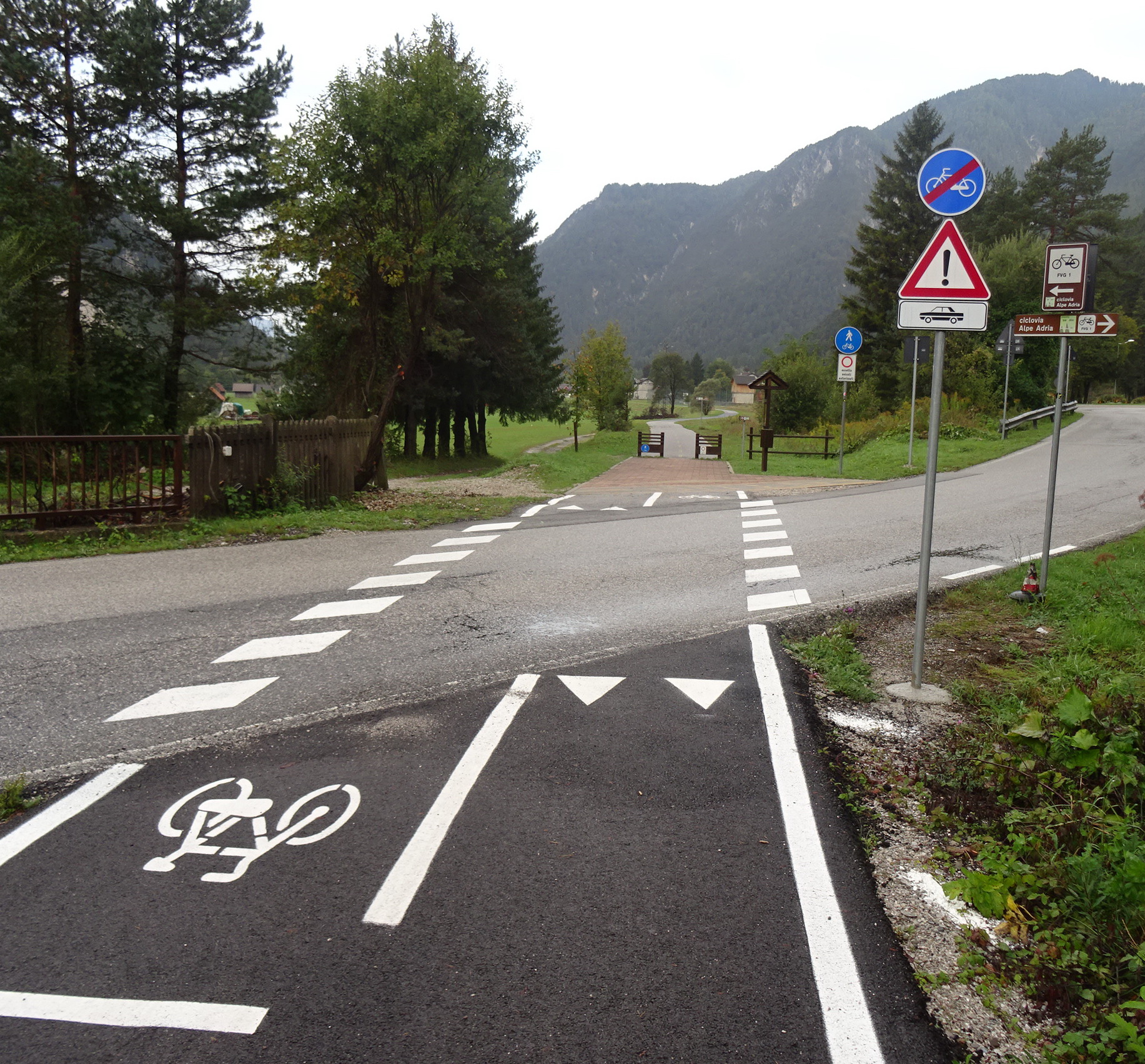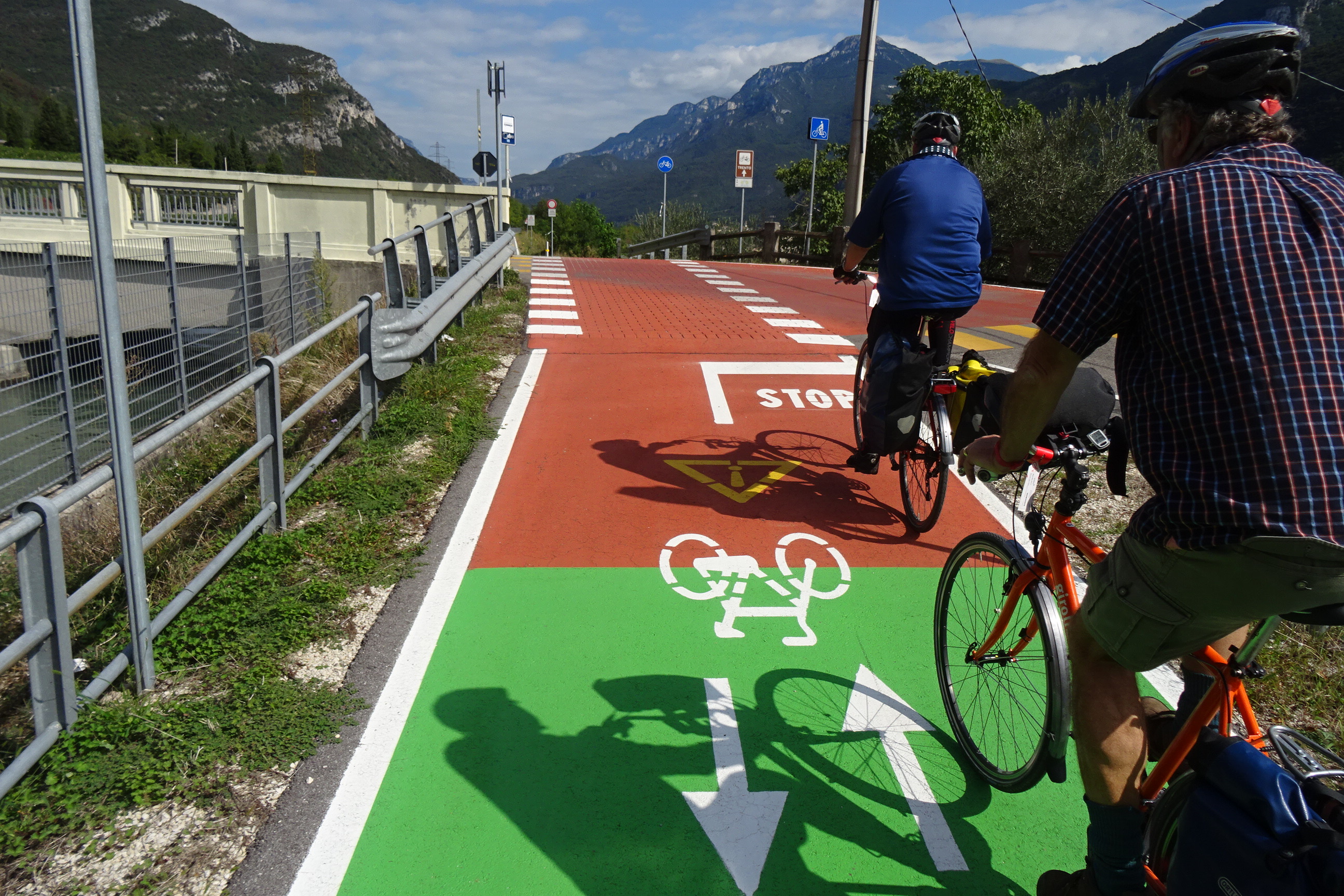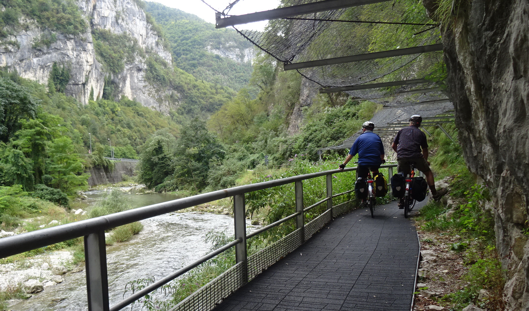 This is a brief record of some of the highlights of our week’s cycling in NE Italy where we enjoyed some excellent cycle routes with details which are of a higher standard than commonly found in the UK on its national routes. We were following parts of Ciclopista de Sol (Euroroute 7 from Munich to Venice) along the Adige River to Trento, the Sugana valley to Bassano del Grappa, the award winning Buke route of the year 2015 Alpe-Adria route down from Tarvisio to Gemona and the railway path from the Slovenian border, past Draga to Trieste.