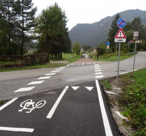 In urban areas the routes were not so clear. Whilst in the historic town centres traffic was slow or the roads largely given over to pedestrians where cycling seemed to be tolerated or encouraged, finding ones way out through the suburbs was not always easy. So for example the Alpe – Adria route bypasses the significant town of Gemona rather than a link being shown. (In May 2015 a new route has been opened from Venzone to Gemona but as yet the way not continued beyond.)