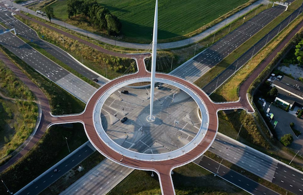 The Hovenring was commissioned by the tech city of Eindhoven, and is a suspended circular cycle bridge with a 70-metre high pylon in the middle. It was opened in 2012, and “floats” above a roundabout.